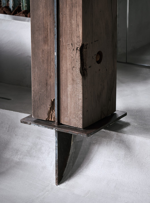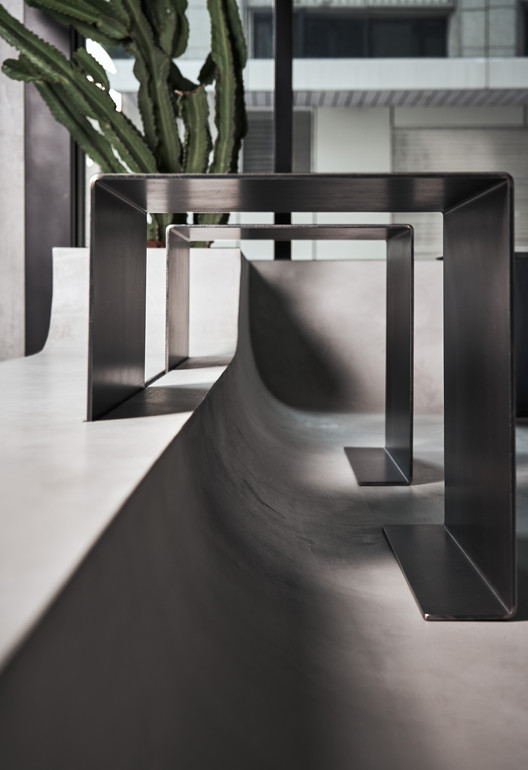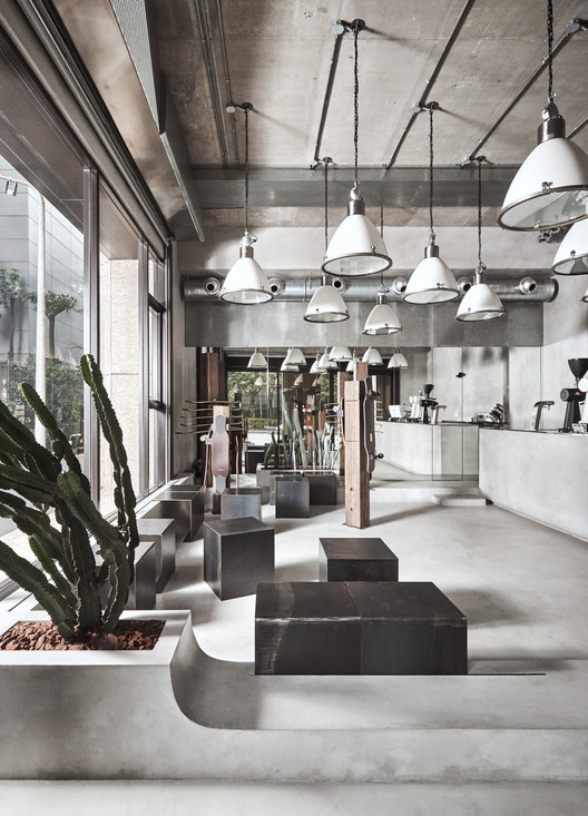 另外我们在空间中的风化木上结合展示功能,弯曲的地景则摆放可随需求移动的座位。客人散坐与风化木及仙人掌的包围之中,正对着隆起的咖啡吧台,观赏着咖啡师在空间中的演出。