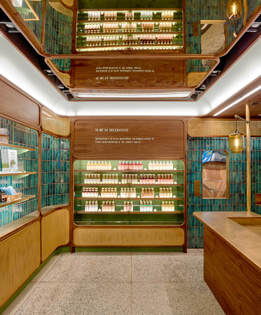 特质的木面板,不光将绿色瓷砖面的冰柜展架包裹在内,同时还向上延伸,覆盖了天花。天花的弯曲设计,则是参考了古旧车厢的顶面。同时,设计师将其漆成薄荷绿,并配备了四面悬挂的烟熏玻璃。当顾客步入店内,天花的镜面就可以呈现出空间内部的场景,将实体的空间设计延展到另一现实维度。
