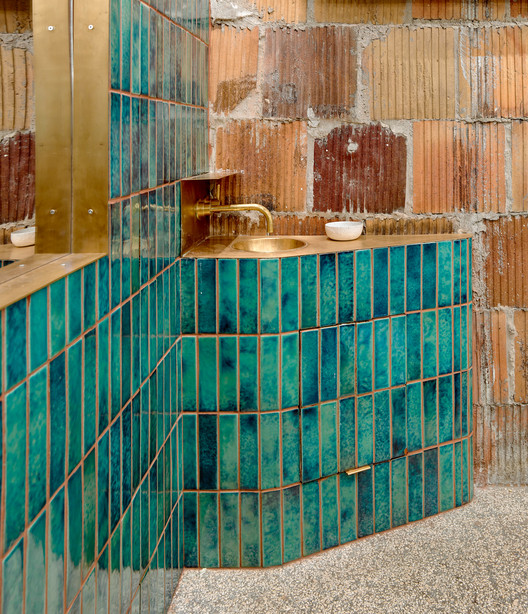 店内东侧的墙面,则是一个保留完好的陶瓦隔墙,设计师将其改造为服务台的背景墙,并在黄铜支柱上安装了一个玻璃吹制的照明灯。此外,店铺的员工还可以通过于瓷砖墙上隐藏着的一扇无缝瓷砖门,进入厨房。所有的材料选择和安装,都是手工完成的,以求打造旧时零售空间该有的古旧样貌。