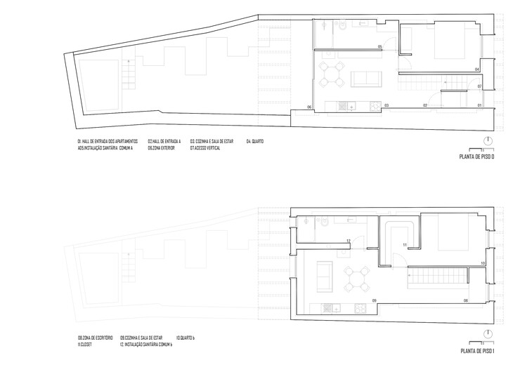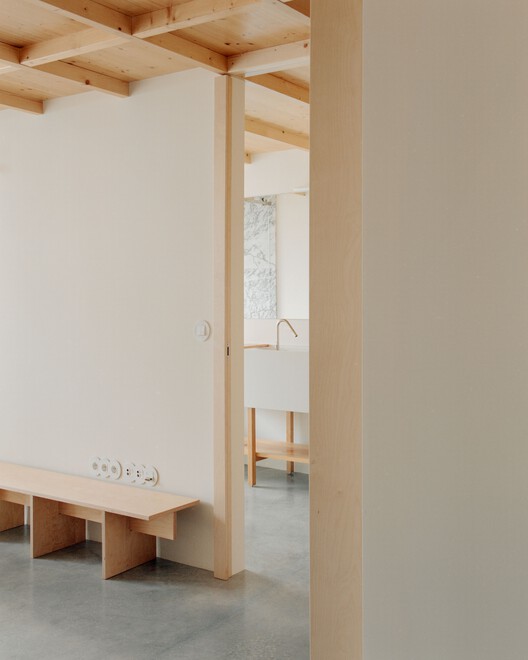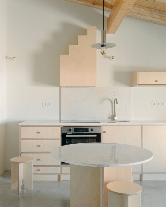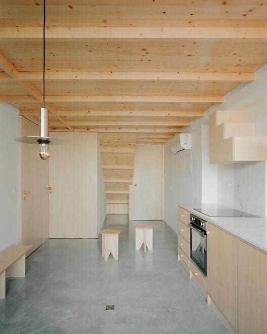Verde Gago 住宅的另一大核心要素是庭院空间。原本的场地曾是一座酒窖,而在改造过程中,这一空间被重新定义,变成了一个带有水景与简约绿化的现代庭院。庭院不仅是社交生活的延伸,同时也强化了建筑与自然的联系,使居住者能够在日常生活中感受到一种静谧且富有品质的空间体验。在空间布局上,项目被划分为两个独立的一居室公寓(T1),分别位于上下两层。每个公寓均包含一间卧室、厨房、起居区、卫生间,以及在上层单元中额外设有一个办公区与步入式衣帽间。垂直交通空间成为结构的核心组织元素,在明确功能分区的同时,也增强了空间的流动感。Verde Gago 住宅通过对旧建筑的敏感再利用,将历史遗产与现代生活方式相结合,以一种低调而富有力量的方式回应了场地的文化背景,同时也展现了当代建筑在历史环境中的介入策略。